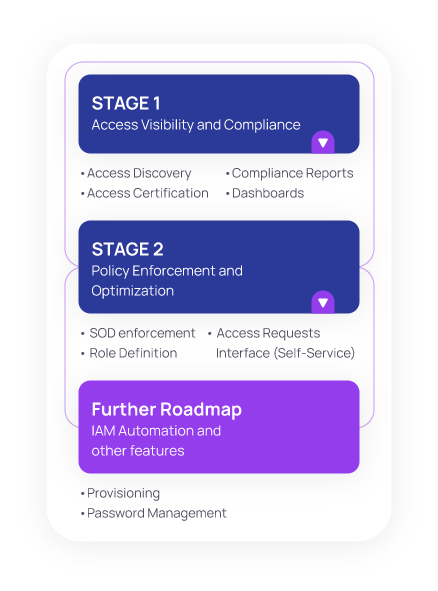 NuSummit Cybersecurity offers a fast-track, two-stage approach to achieving access and identity governance goals. This approach provides a modular and flexible method for establishing the foundation of a robust and secure IAM program. The approach is also extendable to IAM provisioning, automation, and other operational functionalities as needed.